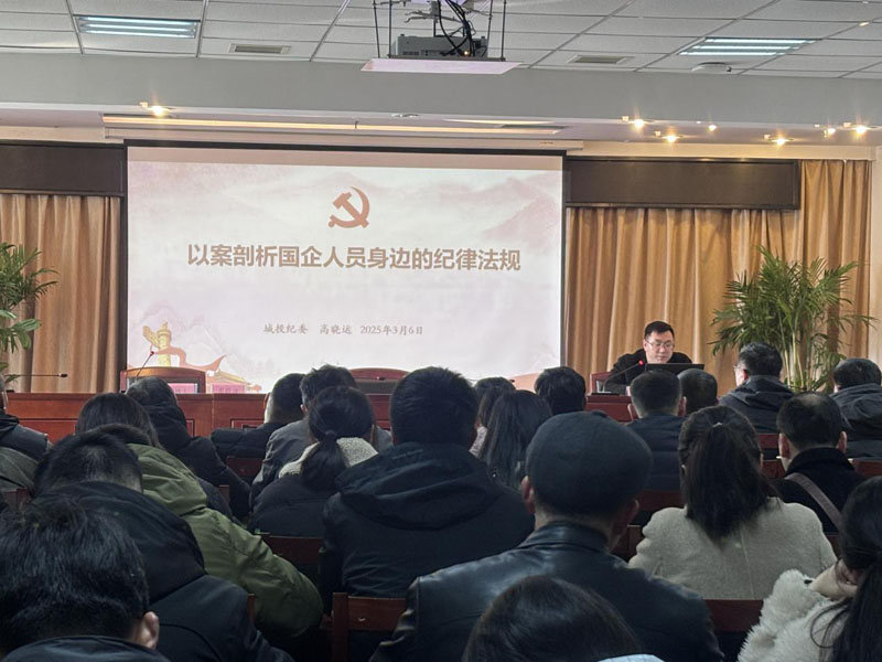 隨后,城投公司紀委副書記高曉運以“以案剖析國企人員身邊的紀律法規”為主題結合各類案例,圍繞“國企人員應遵守的紀律法規、常見的違規違紀行為、爭當國企改革發展的時代先鋒”等內容進行授課,剖析案例本身,引申出對國企人員職業操守和責任擔當的深刻思考,使參會人員對黨紀法規有了更深刻的認識和理解。