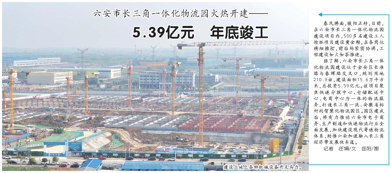 【皖西日報】六安市長三角一體化物流園火熱開建——5.39億元 年底竣工
